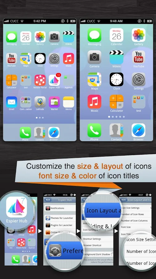 Apple'ın mobil işletim sistemi İOS7'yi Android telefonlarında kullanmak istiyenler için Espier adlı uygulamayı yükleyebilirler. Espier Launcher uygulamasını ücretsiz olarak yükleyip, yeni fontlarınızı, simge ve arama sayfalarınızı kullanmaya başlayabilirsiniz.